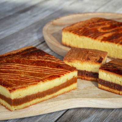 Caramel au Beurre Salé semi-liquide à la Fleur de Sel enfermé dans une coque de Chocolat Noir.